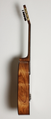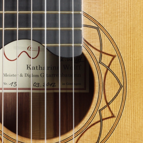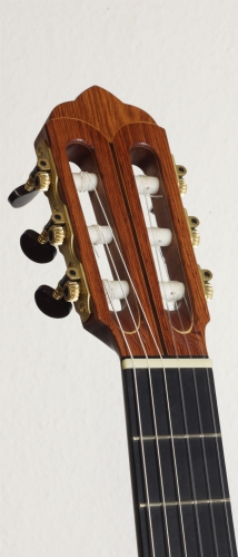 Bei dieser Gitarre fallen als erstes der besonders schöne Boden und die Zargen ins Auge. Sie sind aus aufregend gemasertem, hellrot-rosa farbenem Honduras-Palisander gefertigt. Die Decke ist aus feinjähriger Rot-Zeder, verziert mit einer filigranen Schallloch-Rosette, deren Formen sich in der Kopfplatte wiederspiegeln.