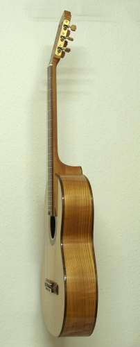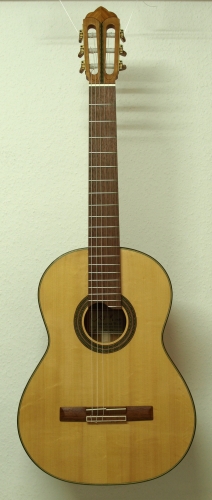 Bei dem Bau dieser Gitarre habe ich bewusst auf tropische Hölzer verzichtet. Der Boden und die Zargen so wie der Hals sind aus europäischem Kirschbaum, wobei der Boden eine wunderschöne Maserung aufweist. Die Decke ist aus europäischer Fichte mit einer Rosette mit grünen Zierspänen. Das Griffbrett und der Steg sind aus Nussbaum.