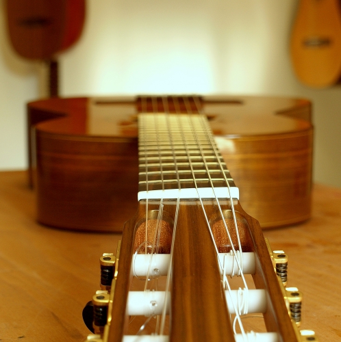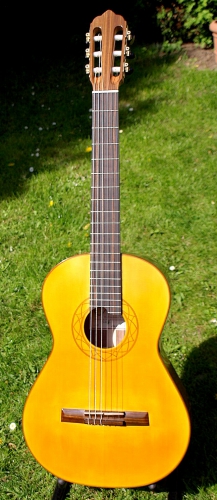 Ein kleines Konzertgitarrenmodell mit einer Mensur von 630 mm. Diese Gitarre wurde nach Wunsch des Kunden mit einem extra schmalen Hals und ergonomisch optimiertem Griffbrett gebaut. Das bedeutet, dass das Griffbrett im oberen Bereich leicht zum Diskant hin gedreht ist, um eine möglichst bequeme Haltung der linken Hand zu erreichen. Außerdem ist das Griffbrett in Querrichtung etwas stärker gewölbt als gewöhnlich, was beim Barrée-Spiel dem Zeigefinger der linken Hand entgegenkommt.