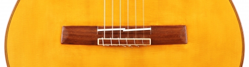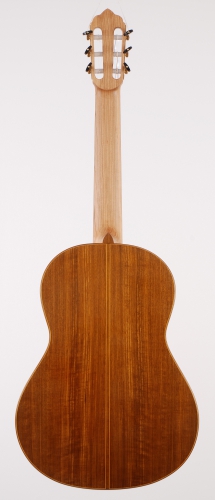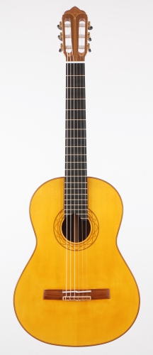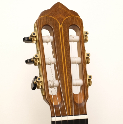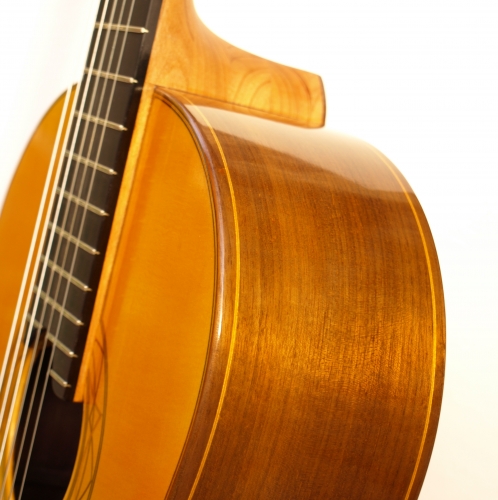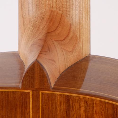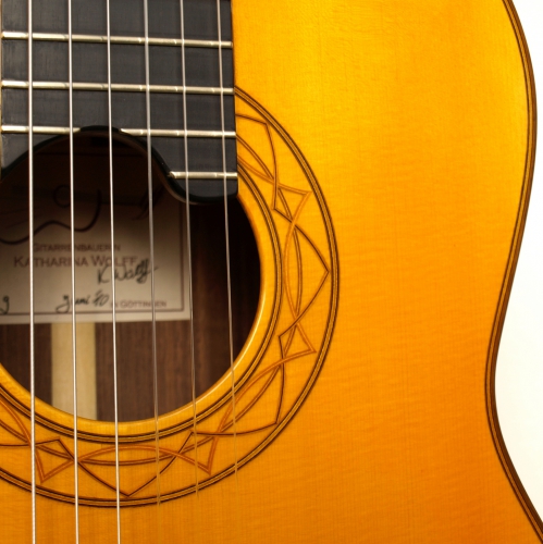 Diese Gitarre ist meine Diplomarbeit. Viele Erfahrungen aus meinem Studium flossen in die Konstruktion der Gitarre ein und ließen meine ganz eigene Form, Ausarbeitung und Gestaltung entstehen. So spiegelt sich z.B. die Form der Kopfplatte in der von mir entworfenen zierlichen Schallochrosette wieder und die Holzarten Nussbaum und Kirsche ziehen sich als „roter Faden" durch alle Zierelemente der Gitarre.